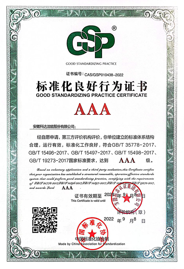 安徽科達潔能歷經(jīng)社會評價、非現(xiàn)場評價、專家現(xiàn)場評價、復核等多階段評價,經(jīng)過中國標準化協(xié)會縝密權威認定,我公司建立的標準體系結構合理、運行有效、標準化工作良好,符合國家標準要求,達到3A級水平。