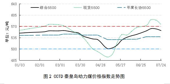 截止2020年7月24日,CCTD秦皇島動(dòng)力煤綜合交易價(jià)格報(bào)收于557元/噸,較年初上漲1.5%,較去年同期下跌3.5%。