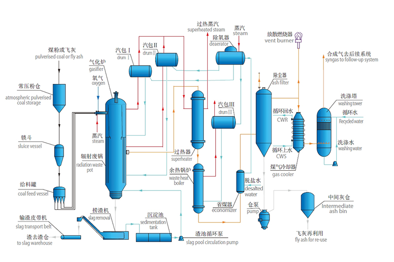 原煤經(jīng)過破碎后進(jìn)入磨煤系統(tǒng)制成合格煤粉,通過氣力輸送至常壓粉倉(cāng),再經(jīng)鎖斗、給料罐加壓送入氣化燒嘴,與氣化劑(純氧或高富氧、蒸汽)在燒嘴內(nèi)充分混合后進(jìn)入氣化爐反應(yīng)室,在極為短暫的時(shí)間內(nèi)完成升溫、揮發(fā)分脫除、裂解、燃燒及轉(zhuǎn)化等一系過程,最終形成以CO和H?為主要成分的粗煤氣離開氣化爐反應(yīng)室,粗煤氣和熔融狀態(tài)的渣在氣化爐中一起下行,渣經(jīng)激冷后進(jìn)入出渣系統(tǒng)由撈渣機(jī)及輸渣皮帶送人渣倉(cāng),粗煤氣經(jīng)輻射廢鍋、蒸汽過熱器、余熱鍋爐梯級(jí)換熱(產(chǎn)生蒸汽,一部分蒸汽裝置自用,另一部分外供)后,進(jìn)入除塵器將粗煤氣中的飛灰分離下來(lái),產(chǎn)生的初凈化煤氣通過文丘里洗滌器及洗滌塔進(jìn)一步除塵降溫,所產(chǎn)生的潔凈煤氣送入客戶指定用氣點(diǎn)。